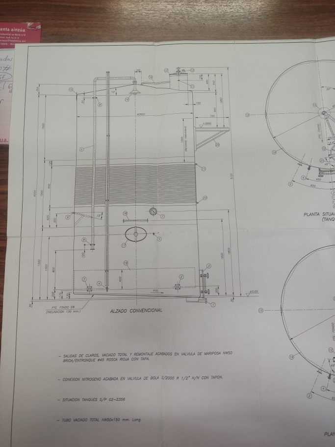 Depósitos de 24.000 litros sobre bancada. Altura máxima 5.131mm / diámetro 2.600mm e inclinación del fondo 130mm (5%)